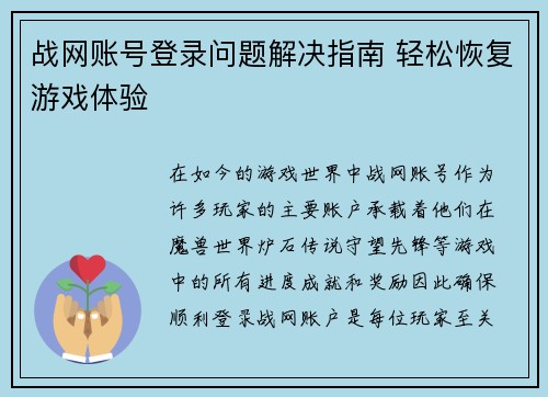 战网账号登录问题解决指南 轻松恢复游戏体验